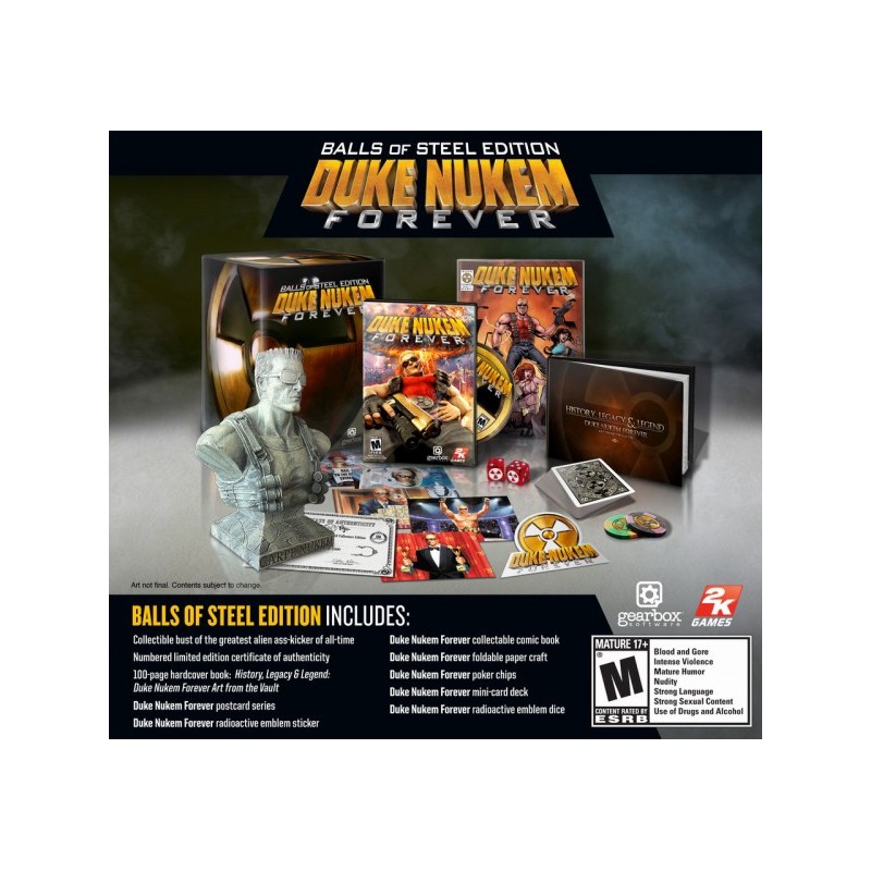 鐵膽限定版內容物包含:.《永遠的毀滅公爵》遊戲軟體.《永遠的毀滅公爵》異形剋星典藏半身像. 限量編號真品憑證.《永遠的毀滅公爵》精裝書冊(約 100 頁).《永遠的毀滅公爵》明信片組.《永遠的毀滅公爵》輻射標誌貼紙.《永遠的毀滅公爵》典藏漫畫.《永遠的毀滅公爵》摺紙模型.《永遠的毀滅公爵》撲克籌碼.《永遠的毀滅公爵》迷你牌.《永遠的毀滅公爵》輻射標誌骰子